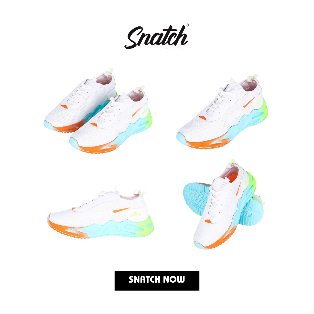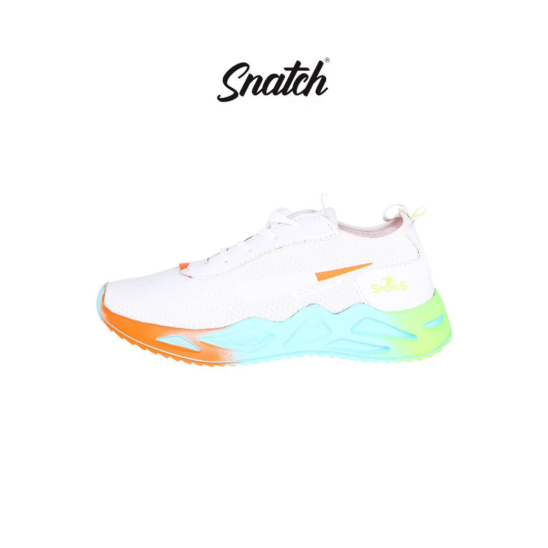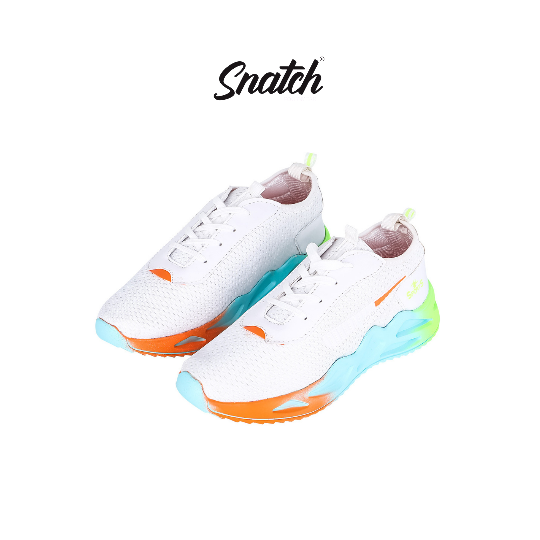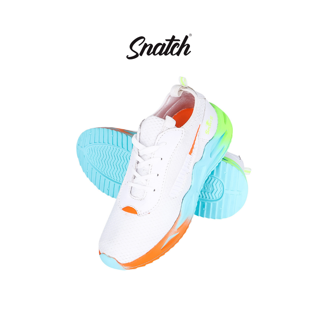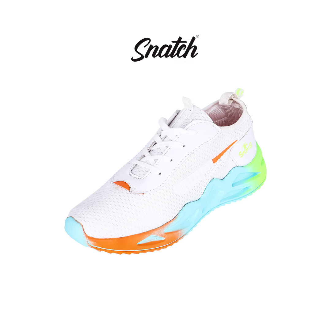 Make a splash with the Snatch Nova Runner, a lightweight athletic sneaker built for high energy and head-turning style. The upper features a clean, versatile white mesh and leather-look construction, while the sole steals the show with a sculpted, multi-color design. The base is a dynamic gradient, shifting from bright bluein the front to green and yellow at the heel, accented by flashes of orange. This shoe delivers a secure, comfortable fit with an energetic pop of color for your run or your daily hustle.