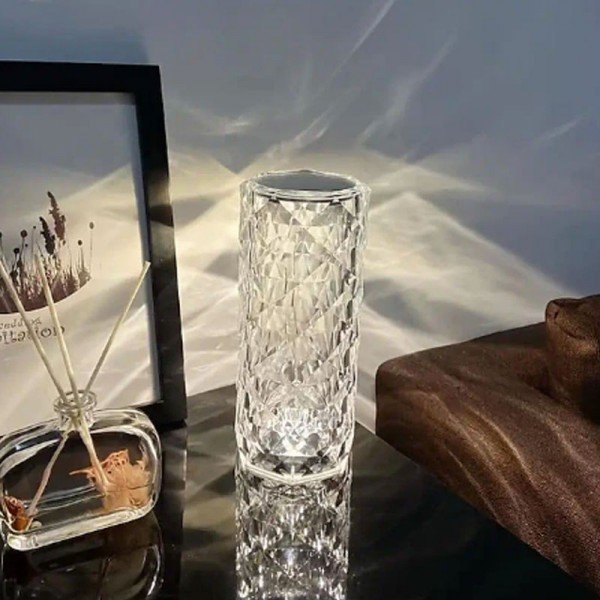 Add a romantic touch to any space with this crystal table lamp featuring a rose light projection. With 3 adjustable colors and touch control, perfect for bars, bedrooms, and as a gift.