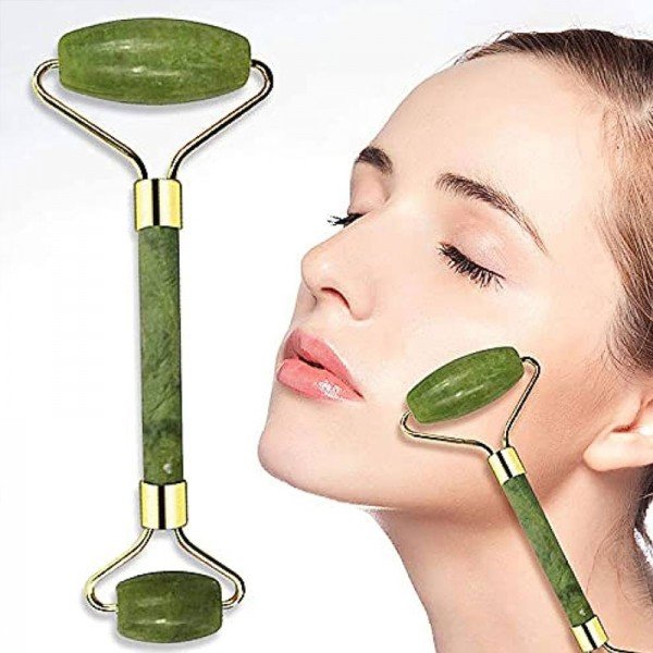 Enhance your skincare routine with this jade roller and gua sha set. Made from natural stone to rejuvenate skin and reduce stress through facial massage.