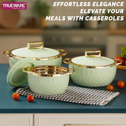 Keep your food warm and stylish with this set of 3 designer insulated casseroles.
