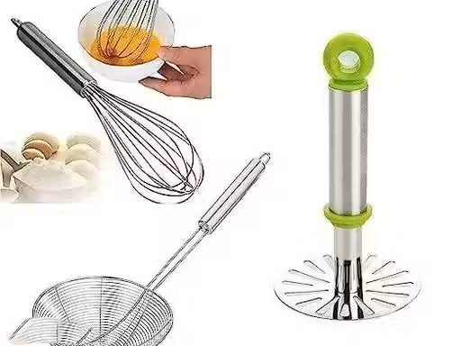 Name : Raheja global The Best Kitchen Essentials Tools Set of 5, Potato Masher,Egg Beater,Tea Strainer,Puri Strainer and Tong/pakkad in Stainless Steel Body